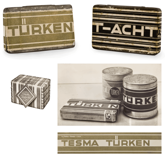 und „Tesma Türken“-Zigaretten, 1924; H. Eidenbenz im Atelier Deffke, Banderole „25 Tesma Türken m/Gold“, um 1924