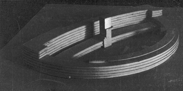 Wilhelm Deffke, Wettbewerbsentwurf für eine Hauptfeuerwache und ein Verwaltungsgebäude auf dem Lessingplatz in Breslau, Modell, von Südwesten aus, 1927
