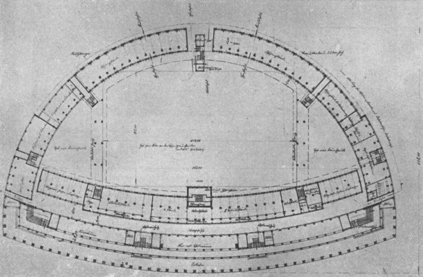 Wilhelm Deffke, Wettbewerbsentwurf für eine Hauptfeuerwache und ein Verwaltungsgebäude auf dem Lessingplatz in Breslau, Grundriss Erdgeschoss, 1927