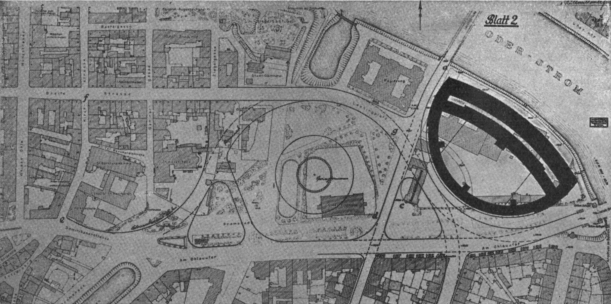 Wilhelm Deffke, Wettbewerbsentwurf für eine Hauptfeuerwache und ein Verwaltungsgebäude auf dem Lessingplatz in Breslau, Lageplan, 1927